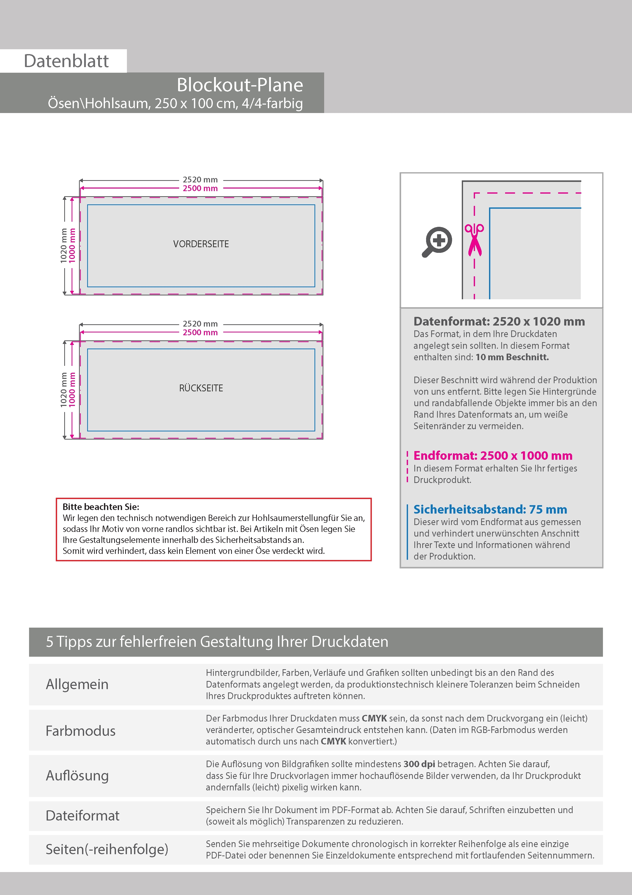 Hochwertige Blockout-Plane 250 x 100 cm, 4/4-farbig bedruckt, Ösen im Abstand von 50 cm oben und unten