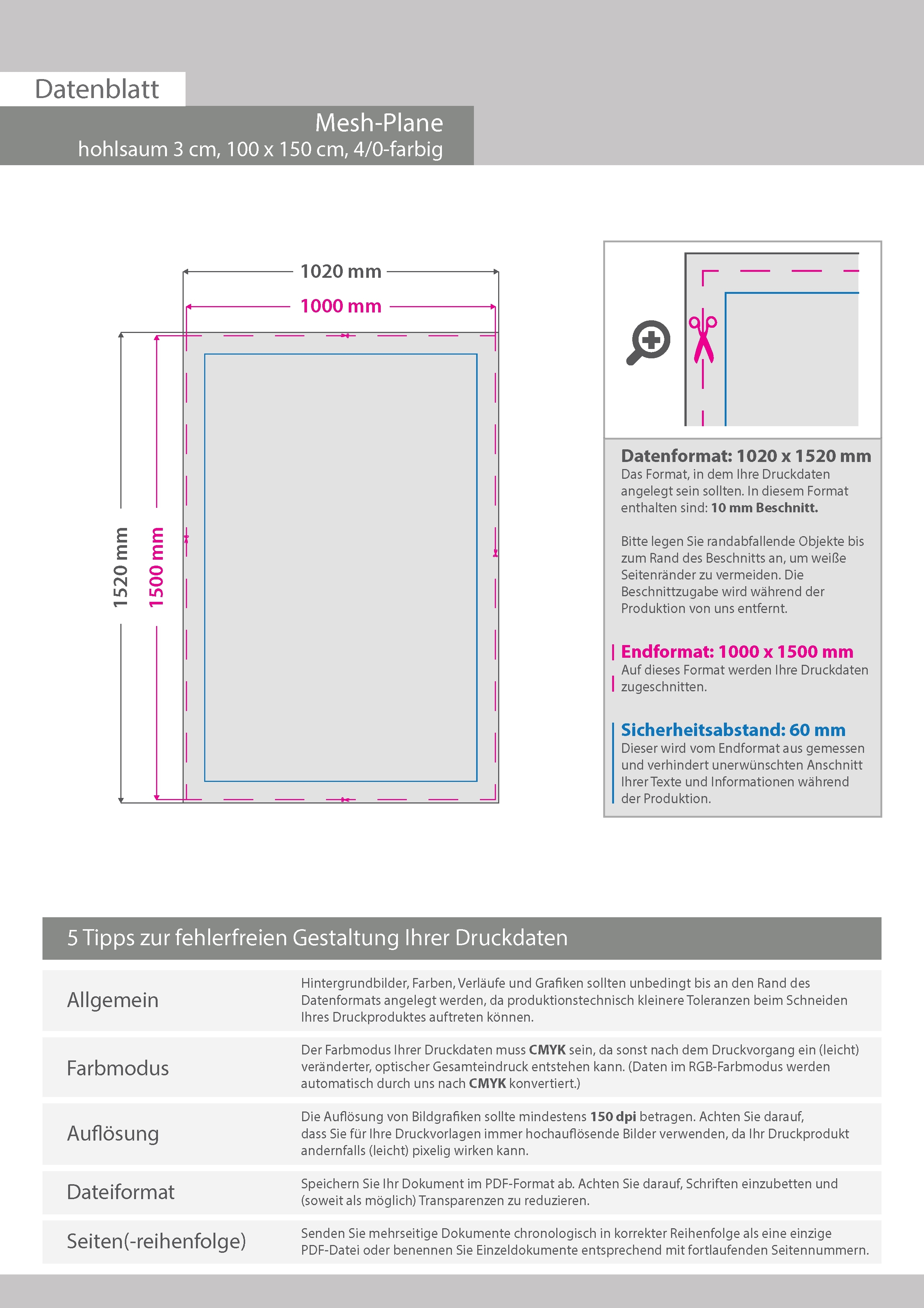 Hochwertige Mesh-Plane (PVC-frei), 100 x 150 cm, 4/0-farbig bedruckt, Hohlsaum oben und unten (Durchmesser Hohlsaum 3,0 cm)