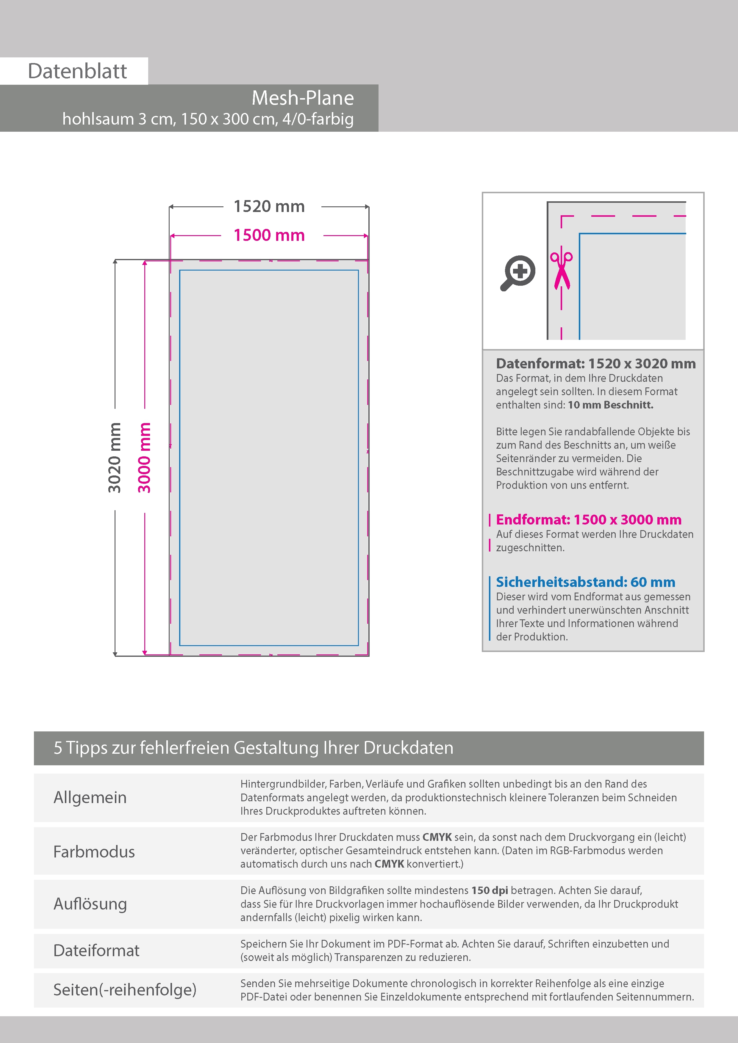 Hochwertige Mesh-Plane (PVC-frei), 150 x 300 cm, 4/0-farbig bedruckt, Hohlsaum oben und unten (Durchmesser Hohlsaum 3,0 cm)