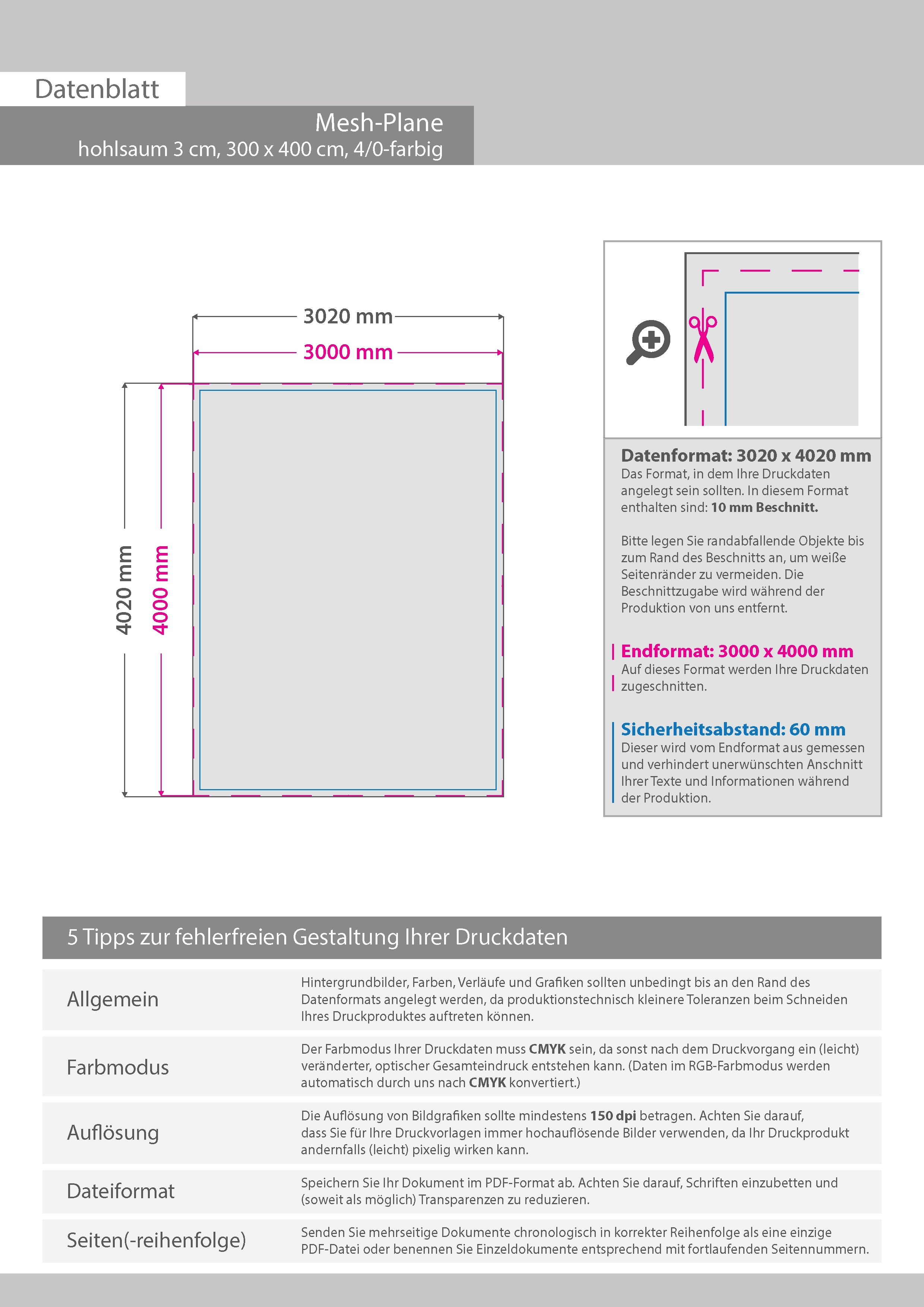 Hochwertige Mesh-Plane (PVC-frei), 300 x 400 cm, 4/0-farbig bedruckt, Hohlsaum oben und unten (Durchmesser Hohlsaum 3,0 cm)